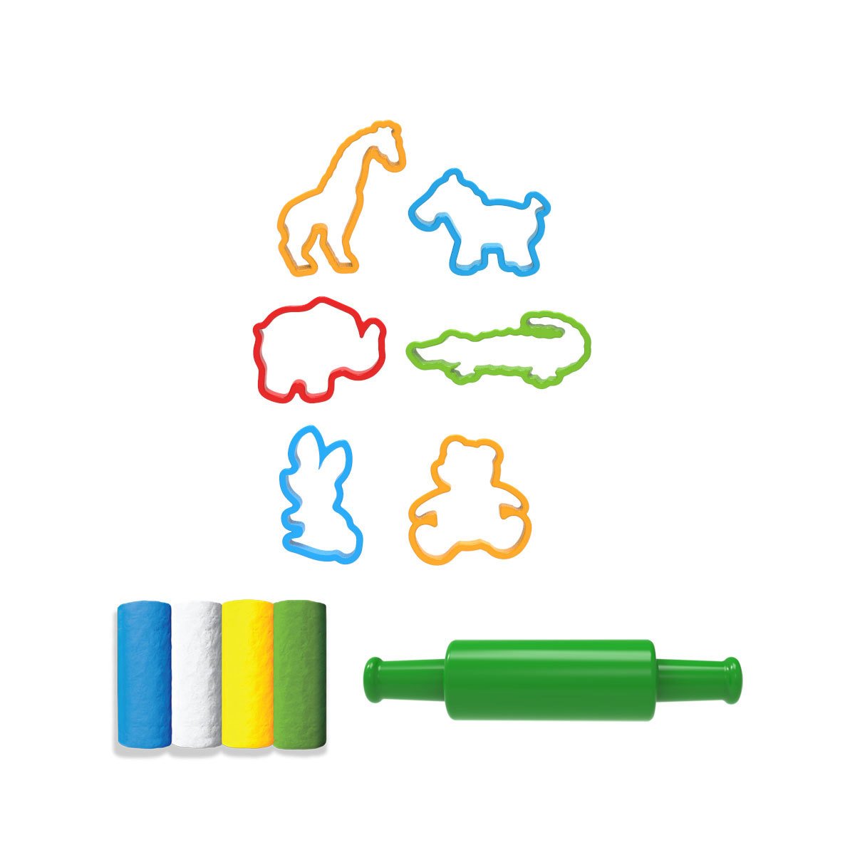 Mavi, Beyaz, Sarı ve Yeşil renklerden oluşan hamurlar ile set içerisindeki kalıplardan