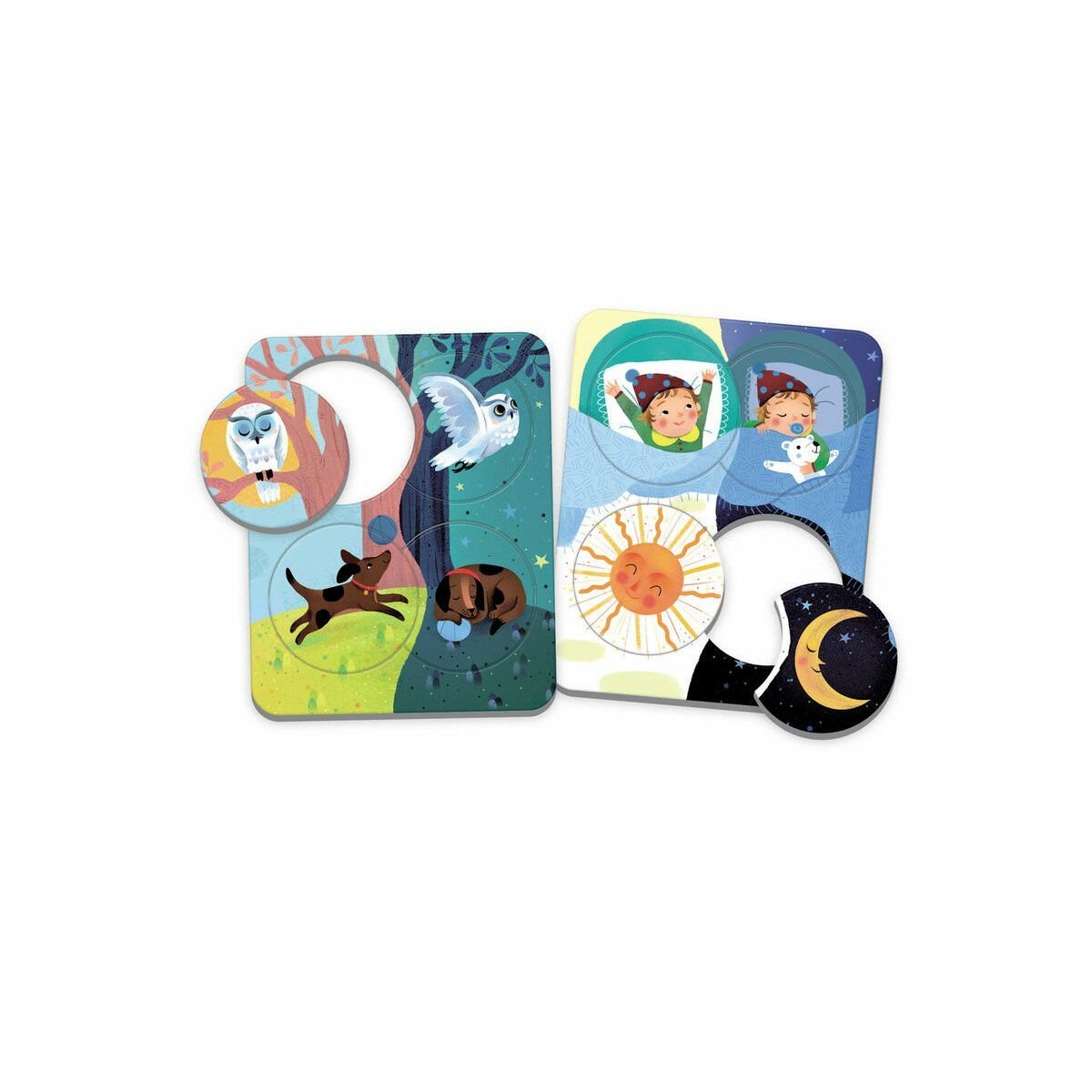 Çocuğun bazı şeylerin gündüz ya da gece görüldüğünde nasıl değiştiğini anlamasına ve bazı gece hayvanlarını tanımasına yardımcı olmayı amaçlayan, geri dönüştürülmüş kartondan 12 mini yapboz içerir.