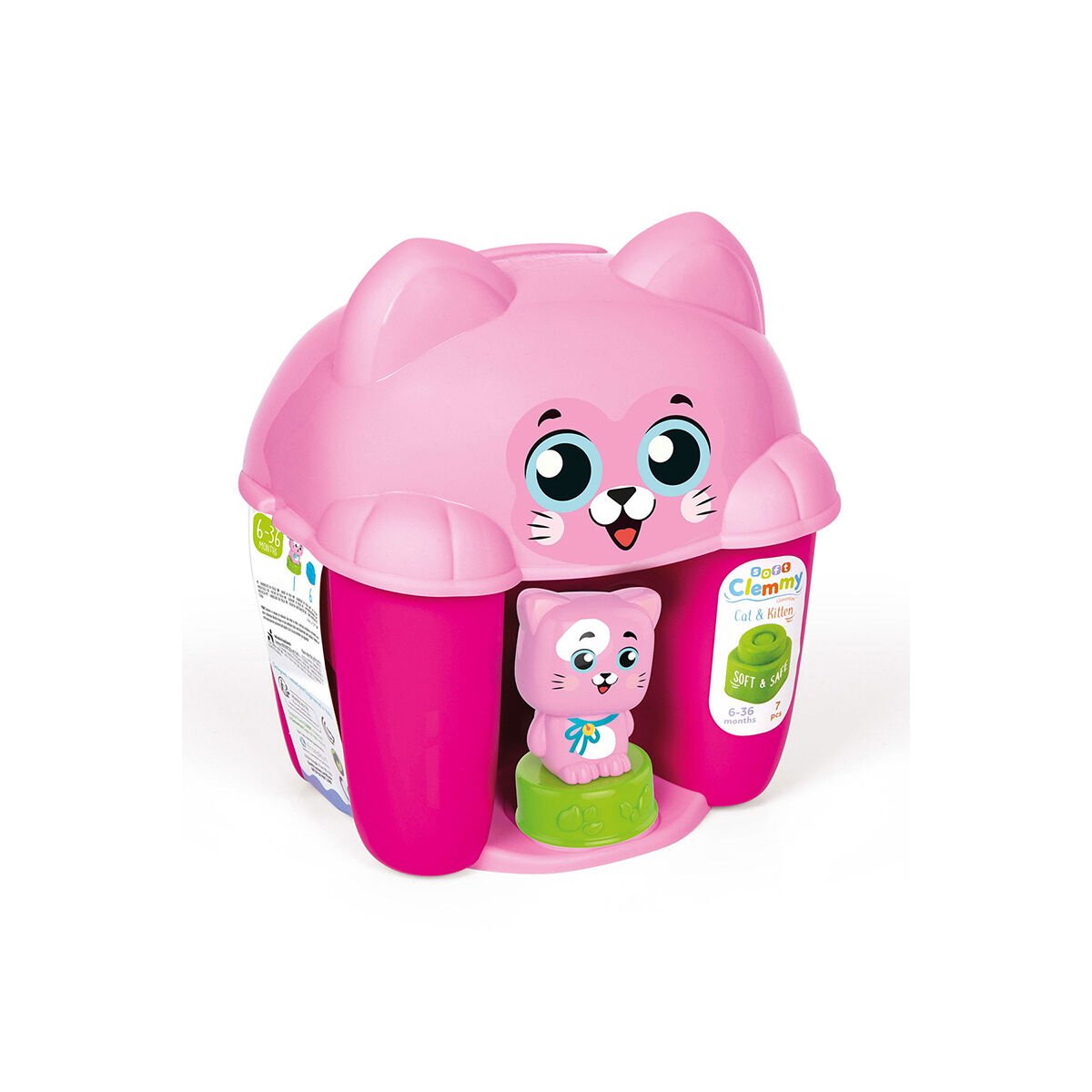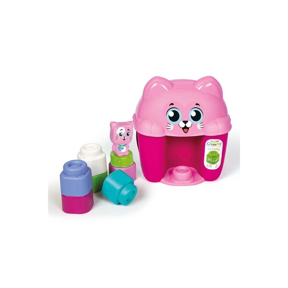 -Bu özel kedi şeklindeki kova, en küçük çocuklarınızın tamamen güvenli bir şekilde oynayabilmesi için tasarlanmış 6 adet Clemmy yumuşak yapı bloğu içerir.