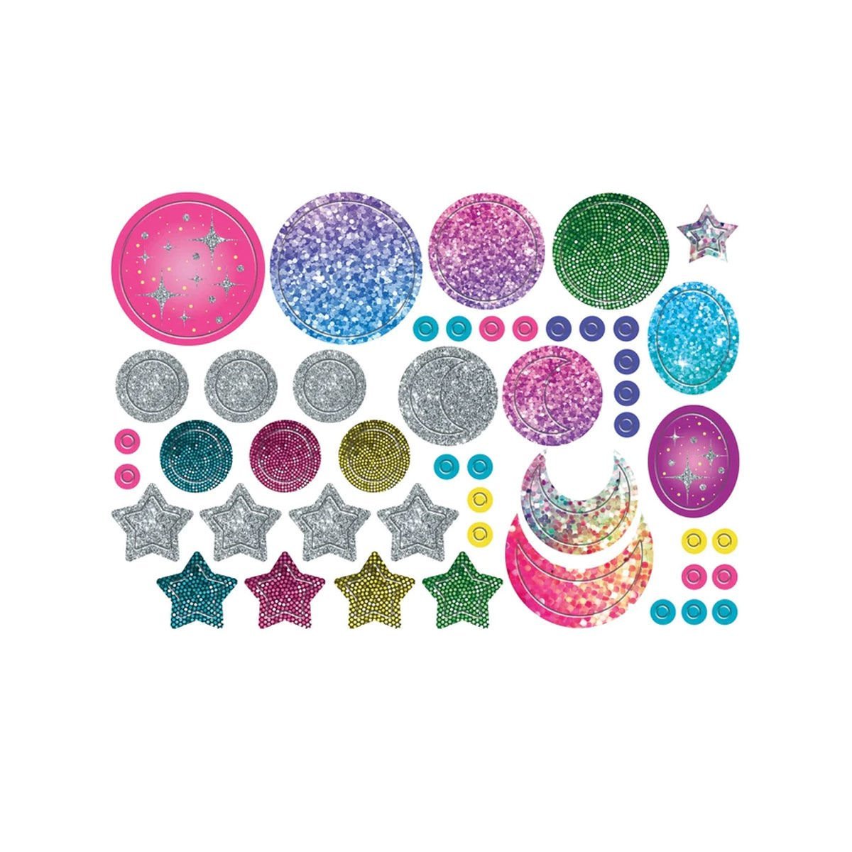• Setin içeriği: alüminyum kolyeler ve yüzükler, metalik ve renkli plastikten yapılmış, ay ve yıldız biçimlerinde uçlar, holografik çıkartmalar ve bir takı standı.