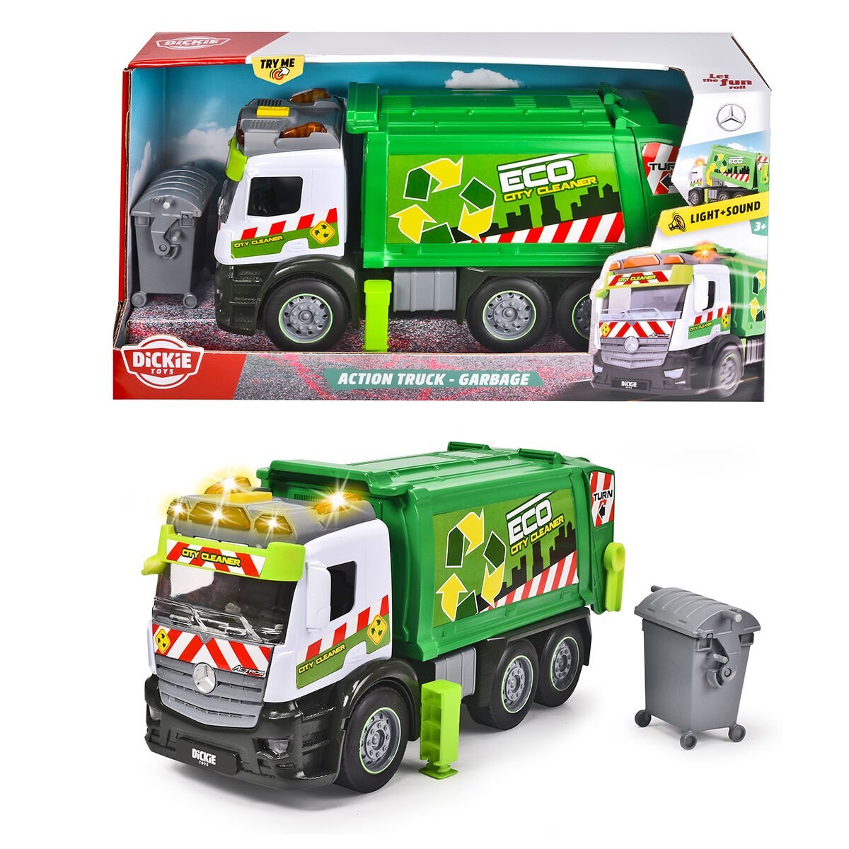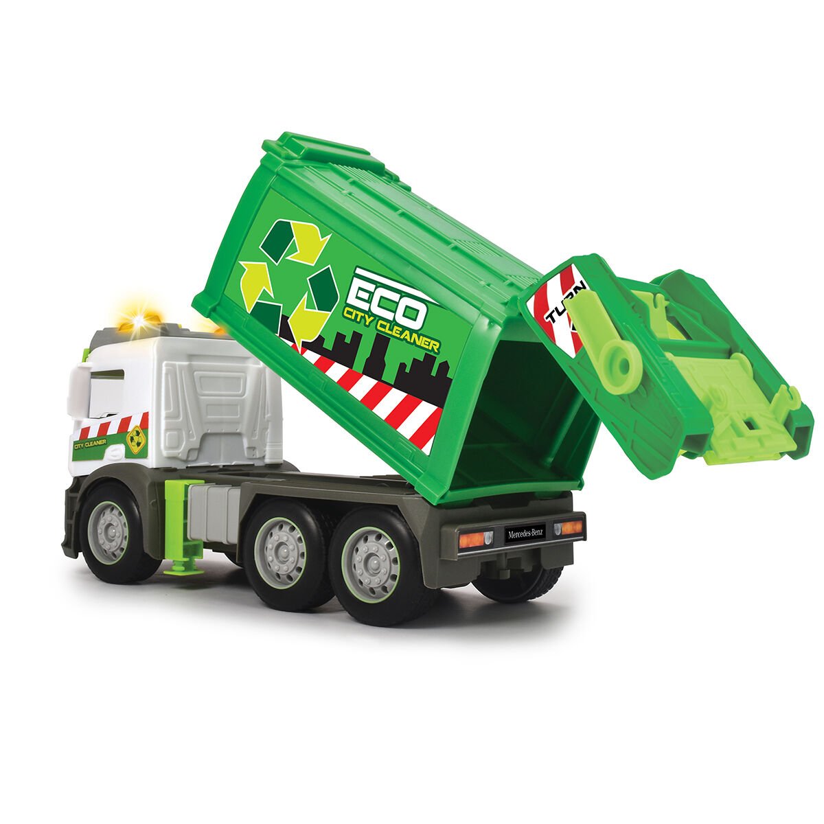 Araç ayrıca, yapı taşları ve küçük nesnelerle doldurulabilen bir tekerlekli çöp kutusu ile birlikte gelir. Çöp kutusu dolduğunda, araçtaki destek sütunlarını açın ve çöp kutusunu yerine yerleştirin. Daha sonra yerleşik kol, çöp kutusunun içindekileri araca boşaltmak için kullanılabilir. Ayrıca, römorku bir çöp sahasında boşaltmak için bir eğme işlevi de vardır. Mercedes kamyonundan modellenmiştir Kamyon, bir Mercedes Actros'tan modellenmiştir ve büyük bir Mercedes logosuna sahiptir.