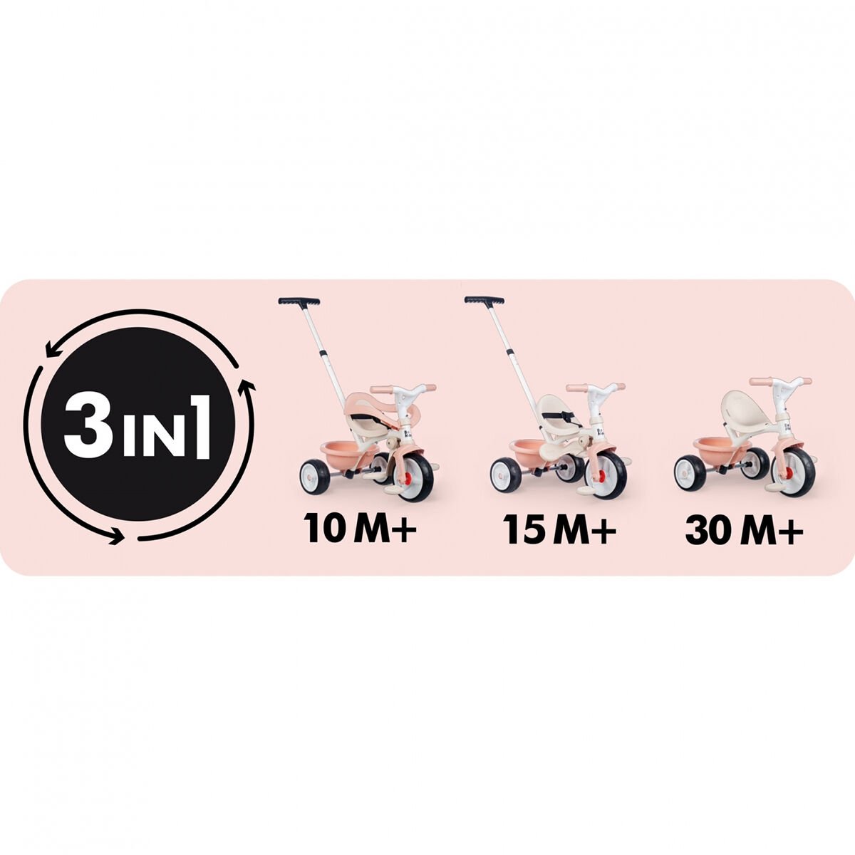 Smoby'nin Be Move Komfort üç tekerlekli bisikleti, üç tekerlekli bisiklet ve bebek arabası özelliklerini bir arada sunar. Emniyet çubuğu, ergonomik kova koltuk, ayarlanabilir emniyet kemeri ve geniş ayak dayanakları sayesinde 10 aylıktan itibaren çocuklar rahat ve güvenli bir şekilde oturur.