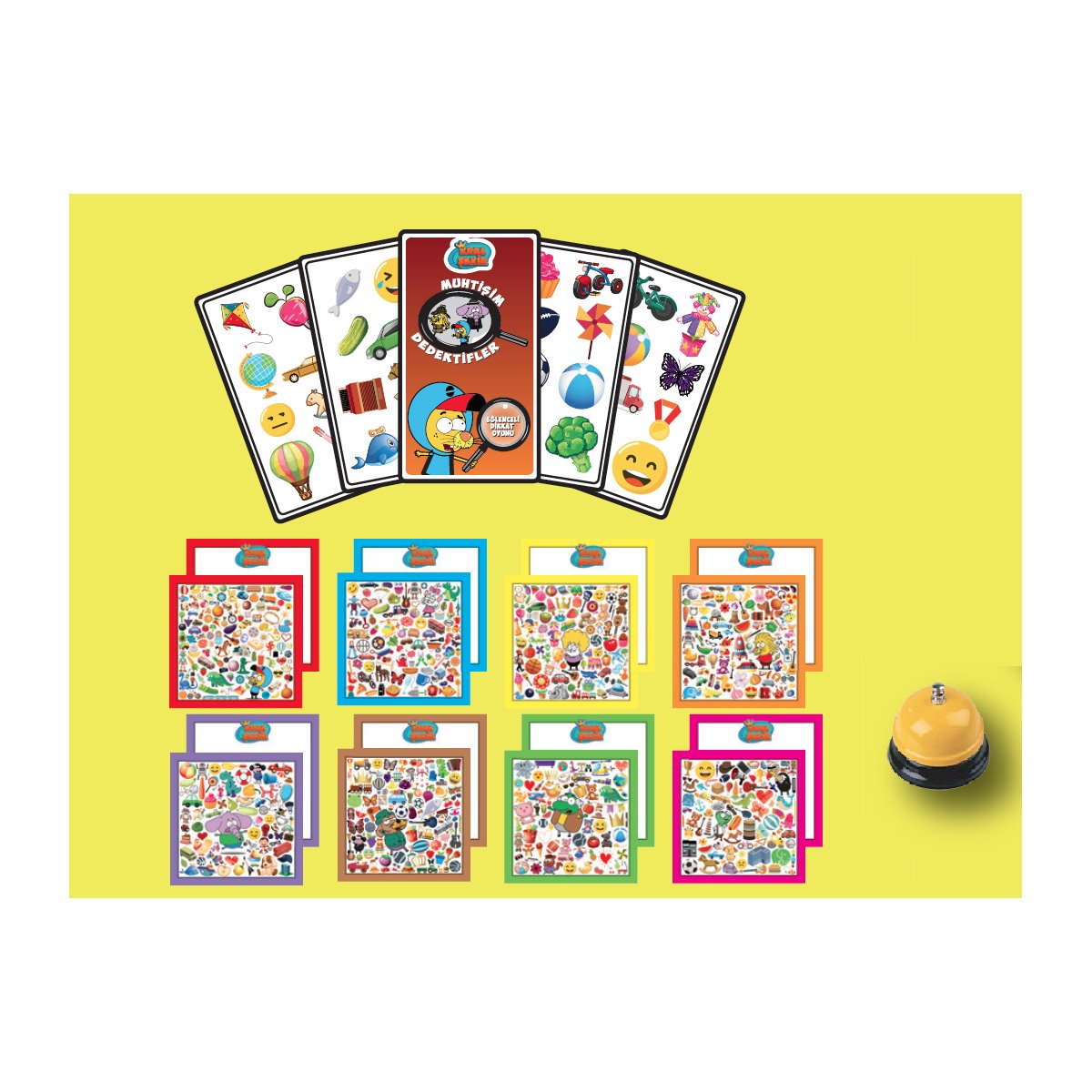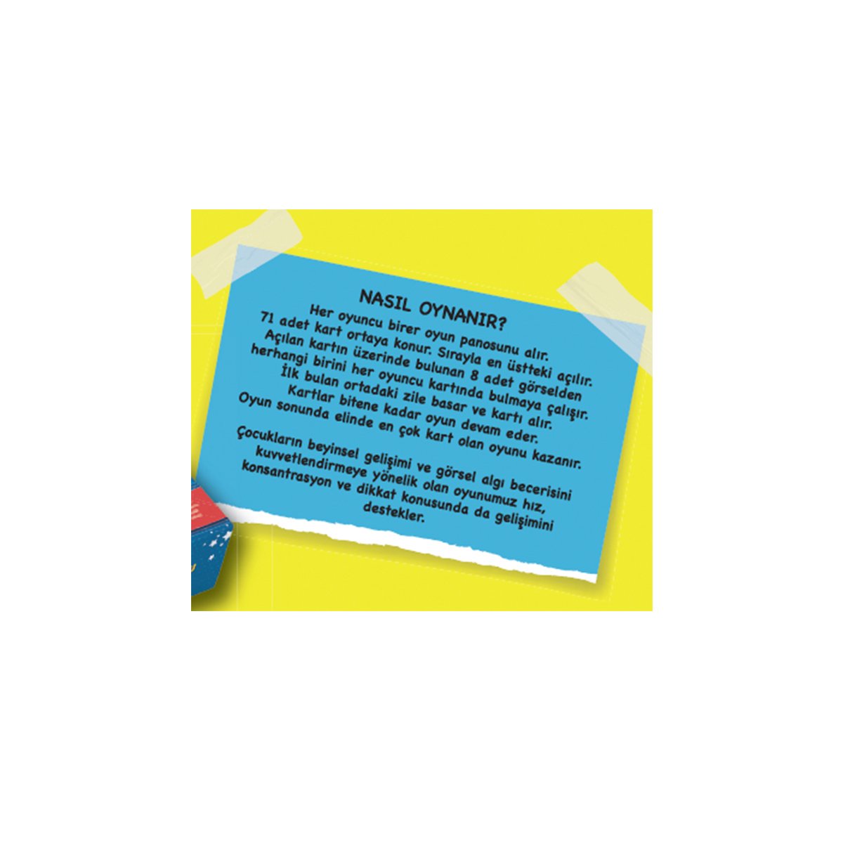 Her oyuncu birer oyun panosunu alır. 71 adet kart ortaya konur. Sırayla en üstte ki açılır. Açılan kartın üzerinde bulunan 8 adet görselden herhangi birini her oyuncu kartında bulmaya çalışır. İlk bulan ortada ki zile basar ve kartı alır. Kartlar bitene kadar oyun devam eder. Oyun sonunda elinde en çok kart olan oyunu kazanır. Çocukların beyinsel gelişimi ve görsel algı becerisini kuvvetlendirmeye yönelik olan oyunumuz hız, konsantrasyon ve dikkat konusunda da gelişimini destekler.