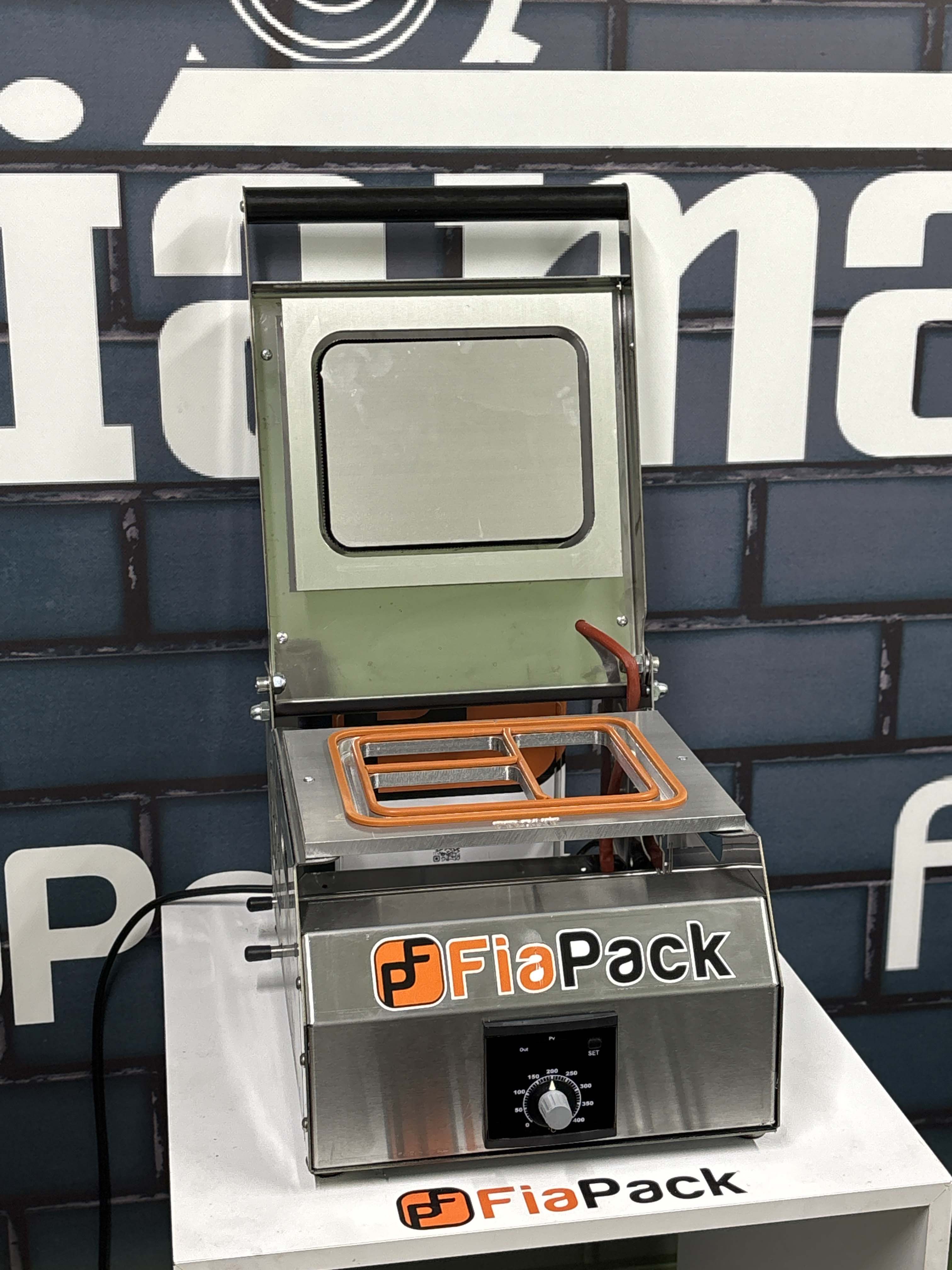 FIAPACK MODEL III: Dakikada 6 döngü yapabilen sıfır atık film kesme sistemine sahip, tamamen taşınabilir, elle çalıştırılan bir tabak yapıştırma makinesi.