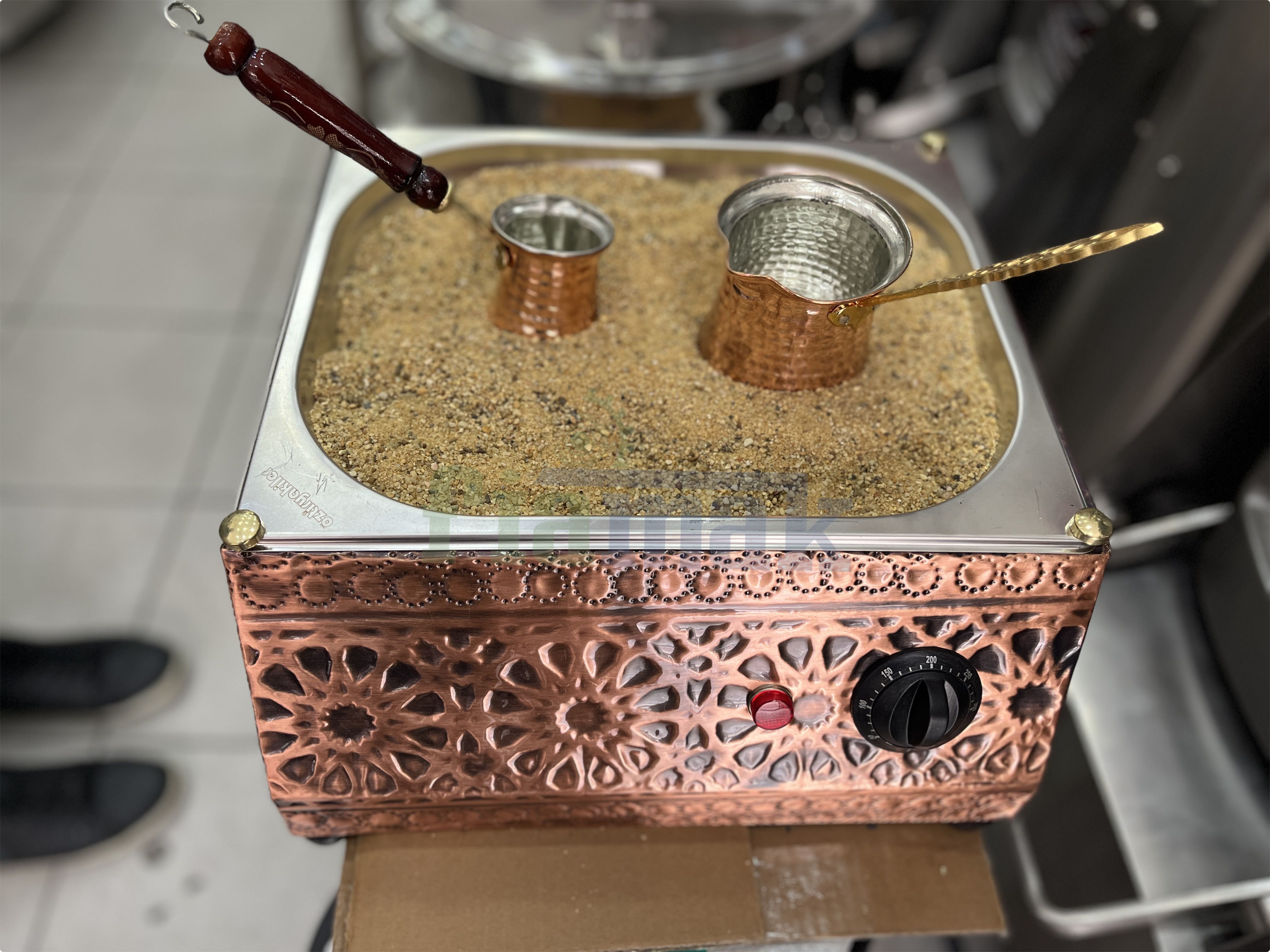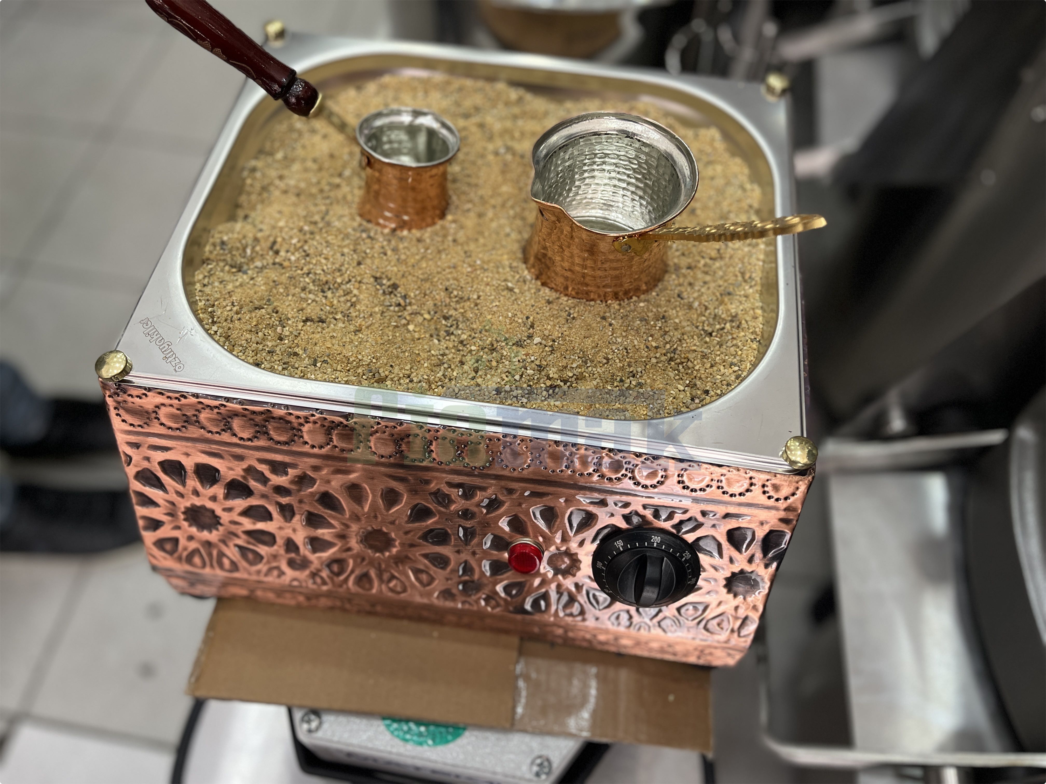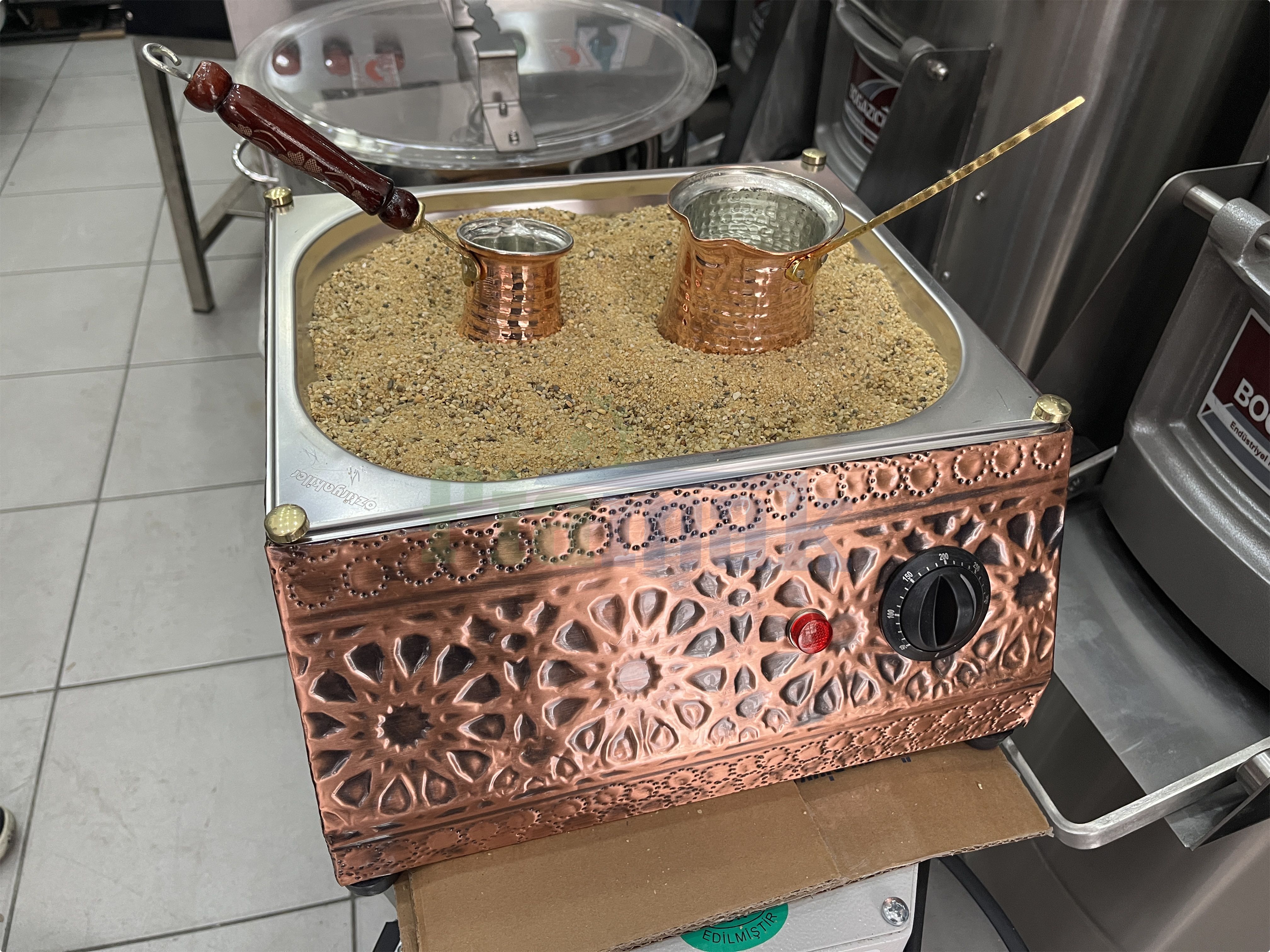 Kumda kahve makinesi paslanmaz çelik üzeri bakır kaplamadır. 38x38x18 cm ölçülerinde olup 1250 w güç kapasitesindedir. Ürün içerisinde 1 adet özel quarz kumu bulunmaktadır. Kumda kahve makinesi üç cezve kapasitesindedir. Üzerinde bulunan termostat kontrol paneli ile istenilen sıcaklıkta kullanım sağlar. Makinelerin yaygın servis ve yedek parça ağı ile satış sonrası da en hızlı, en ucuz ve en güvenli çözüm hizmetlerinden yararlanabilirsiniz. Ürünlerimiz adınıza faturalı olup 1 yıl garantilidir. Ev, otel, restaurant, cafe ve bar gibi işletmeler için idealdir.