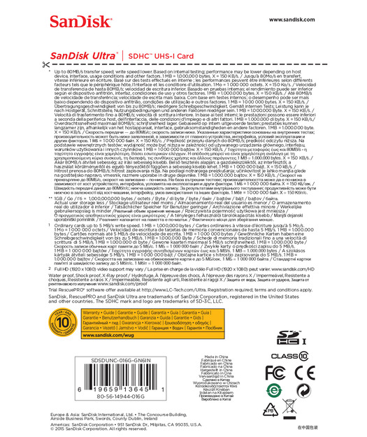 SanDisk Ultra SDHC 16GB 80MB/s Class 10 UHS-I